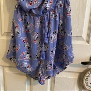 Blue Rain Paisley Print & Rose Romper / Jumpsuit in women’s size small. Pretty blue color with blue Roses and red flowers in a paisley print. Elastic around waist & drawstring tie. Perfect for 4th of July & summer! Shorts w/ inseam measuring approx 2.5 in. Pit to pit measures approx 17 in, length down center front measures approx 23 in. In very good used condition w/ no flaws or stains and minimal wash wear. Please see close-up pictures for condition details. Off the shoulder. Lined. Spring. Vacation ready. Beach. Cruise.