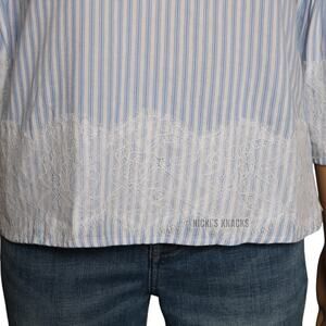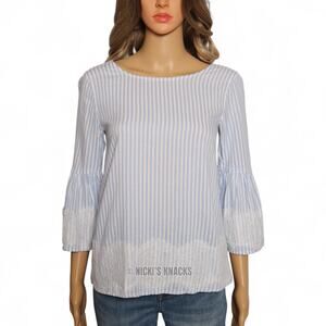 Blue Rain Striped Bell Sleeve Blouse Lace Trim Tie Back Boho Chic Light Blue XS