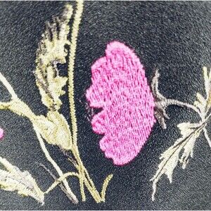 Black Polyester Spandex with embroidered flowers in Pinks Marigold Green. Ruffle at sleeves continues along bustline front and back. Above ruffle front and back are black netting with keyhole back button enclosure. Extra buttons in bag are still attached.