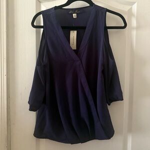 Chic cold shoulder v-neck blouse by Blue Rain. Deep blue hue. Stylish and versatile. 3/4 length sleeves.