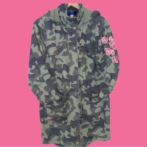 Euc! Cool camo style zip and snap closure with hoodie and pockets! Cute pink floral design on front and sleeve! 19” pit to pit….30” shoulder to hem…23” sleeves
