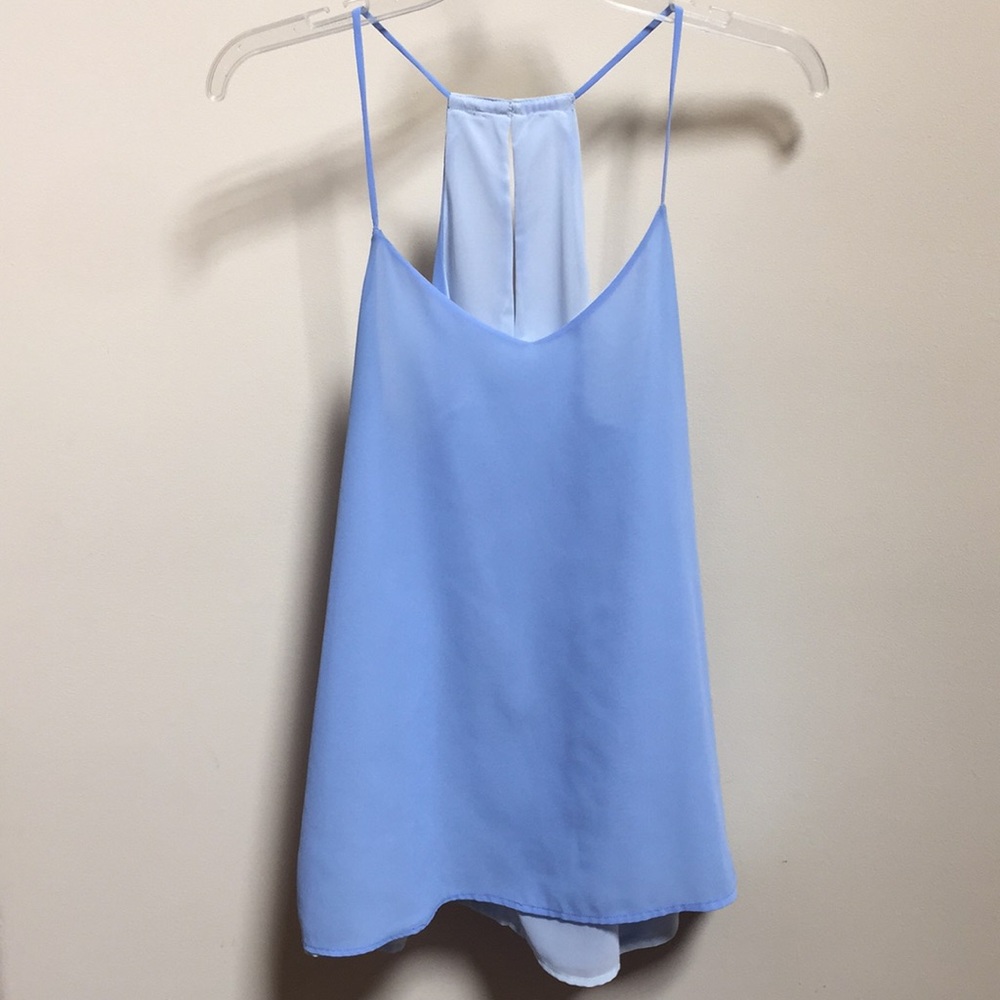 Baby blue/ powder blue razor back blouse top. OS. fits a S/M comfortably. Small rip on inside lining of the shirt but does not effect the way it looks on the outside. In great condition!