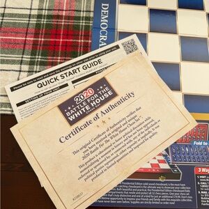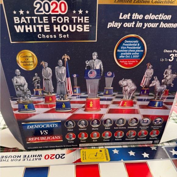 Official 2020 Battle for the White House chess set featuring vivid blue and red game pieces. Includes detailed themed sculpted pieces for immersive play and display. Perfect for collectors and players who enjoy political-themed board games. Colors: blue and red.