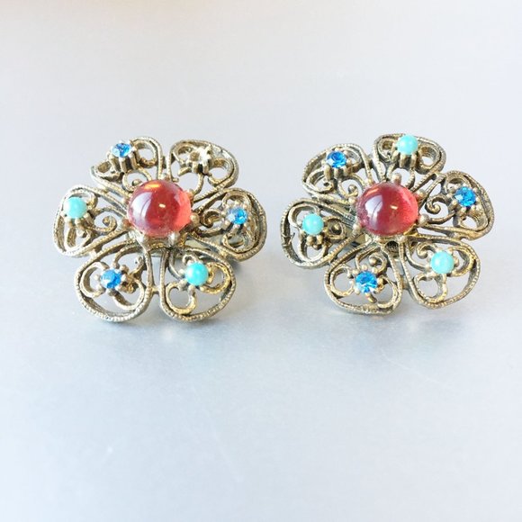 Blue Red Floral Filigree Clip on Earrings Vintage Jewelry