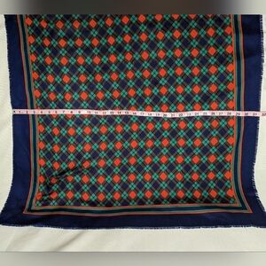 Square plaid scarf with fringe edges. Measurements are 31" both ways
