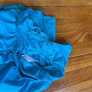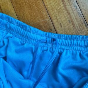 Vibrant aqua running shorts with drawstring waist and built-in underwear. No flaws!