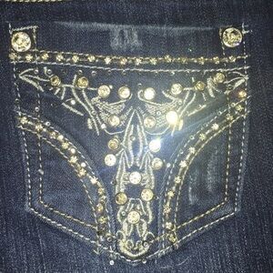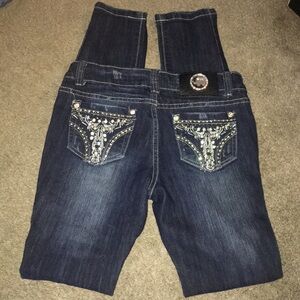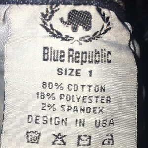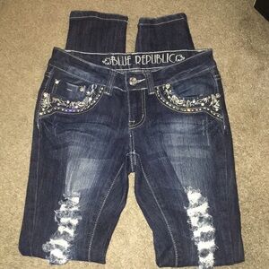 Blue Republic Distressed Bling Skinny Jeans Size 1 Dark wash with distressing on front of legs and whispering in back of knees. EUC except for the bling some are loose and need to be tacked down some of the smaller ones are missing but it is hard to see. Flat lay measured waist 13.5” Rise 7” inseam 29”