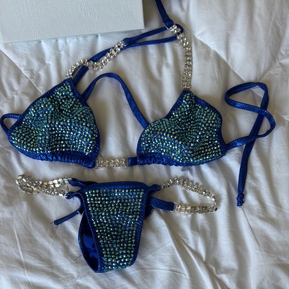 Stunning blue and green rhinestone bikini set. Features sparkling details. This is a competition bikini from cj’s elite competition wear. WORN ONCE. Absolutely perfect condition! Extra fabrics so you can get it custom to your waist! The top I would say can fit anywhere from a xs - medium. Comes in box. I am the original owner and this bikini was 100% custom! It can be worn as a bikini competition bikini or just any stunning swimsuit. It has a little weight to it because these are actual crystals. It’s VERY GOOD quality, top tier!