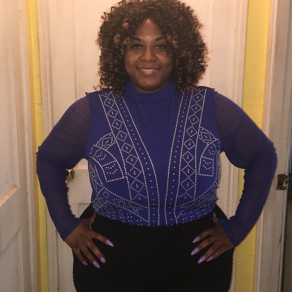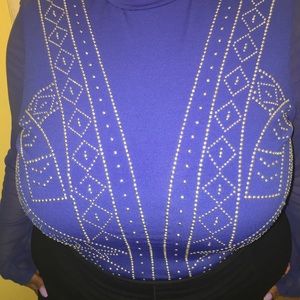 This bodysuit is in the color blue. It has rhinestones on the front. Plain in the back. Mesh sleeves on the side. Snaps between the legs. Size 22/24.