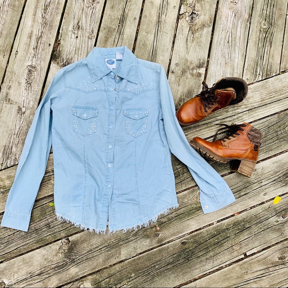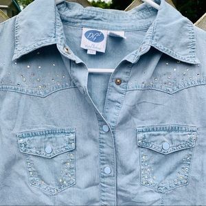 Adorable blue rhinestoned button down shirt! Cute for horseback riding!
