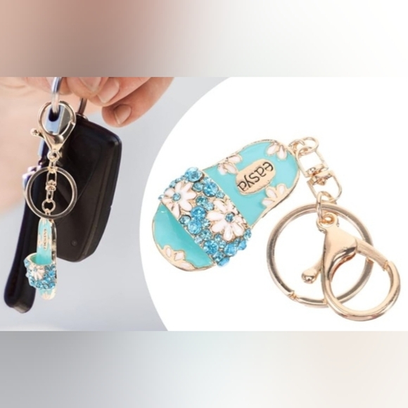 Charming keychain featuring a blue and gold sandal with floral accents. Perfect for adding a touch of style to your keys.