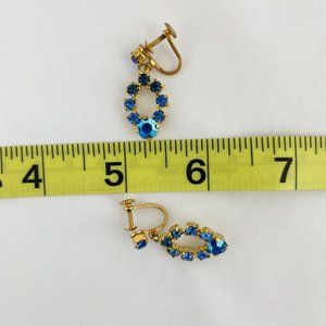 Blue Rhinestone Gold Tone Dangle Screw Back Earrings
