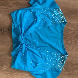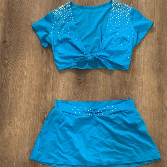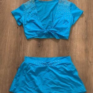 Stylish blue two-piece set with rhinestone embellishments. Includes a tie-front top and matching skirt. From DallasWear Uniforms. Worn once, excellent condition. Size medium.