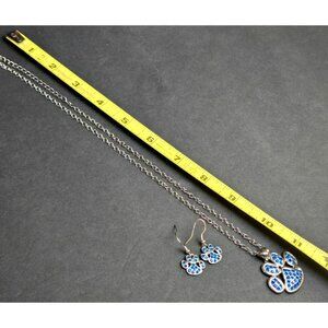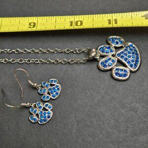 Blue Rhinestone Paw Pendant Necklace & Earrings Set Silver Tone Fashion Jewelry