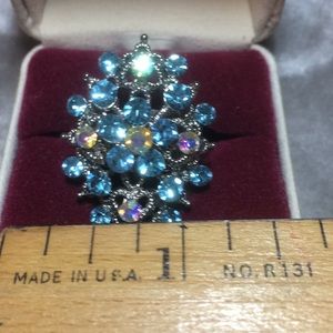 Lovely light blue stones accented with iridescent stones set in sliver colored metal on an adjustable band. Statement Ring.