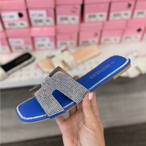 Stylish blue slide sandals adorned with sparkling rhinestones. Perfect for adding a touch of glamour to any outfit.