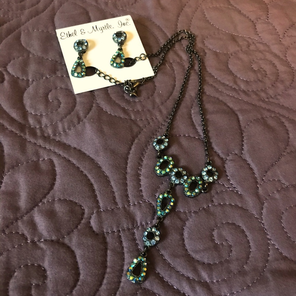 Lovely earrings and matching necklace. Dark silver/bronze-colored chain.