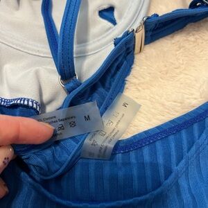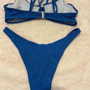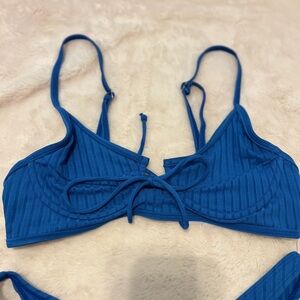 Stylish blue ribbed bikini set. Features a tie-front top and high-cut bottoms.