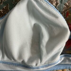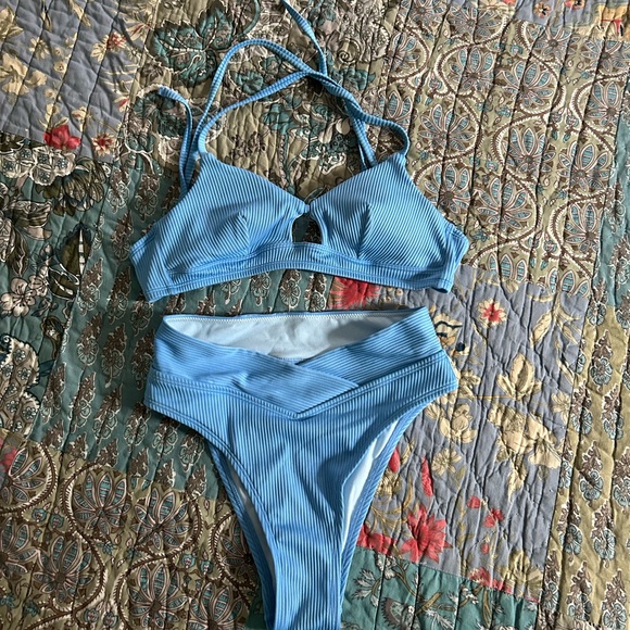 Stylish blue ribbed bikini set. Features a unique cut-out design. Perfect for beach days. Tie back top, excellent condition aside from some slight discoloration on the inside of the top (looks like sand). From cupshe, didn’t realize there weren’t any care tags. Size xs for both, I found the bottoms to run a little large on me. 4’11 100lb, typically 000-00 in sizing. Top fits me even at 30D.