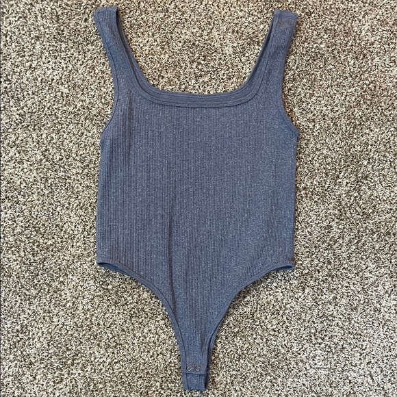 Stylish blue ribbed bodysuit with a scoop neckline. Perfect for layering or wearing alone.