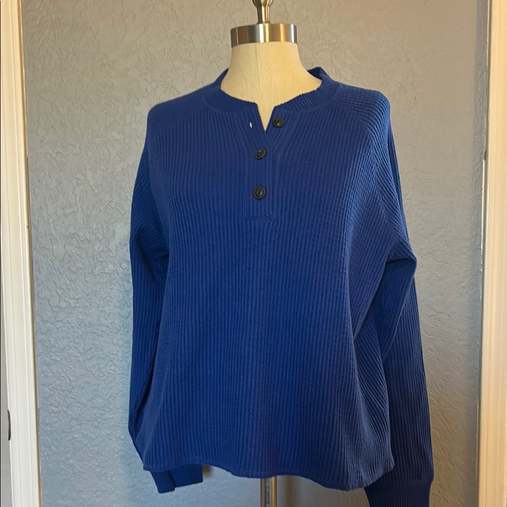 Stylish blue ribbed sweater with button-up design. Perfect for casual wear.