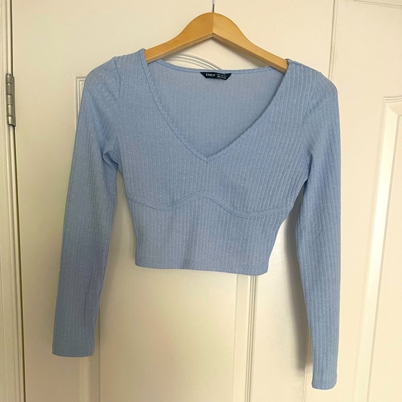This stylish crop top in powder blue features a flattering V-neckline and long sleeves in a versatile blue hue. Made from a ribbed, stretchy fabric, it offers a snug fit that accentuates your silhouette. Ideal for casual outings, this minimalist design is both comfortable and chic.