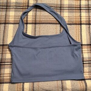 Stylish blue ribbed halter top. Perfect for casual outings.