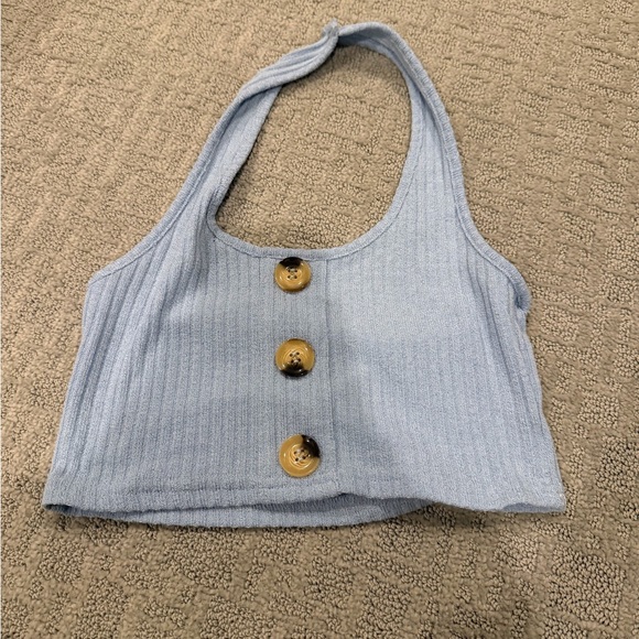 Stylish blue ribbed halter top with button details. Perfect for casual outings.