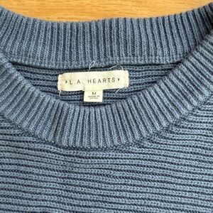 Stylish knit top in denim blue. Features ribbed texture and crew neckline.