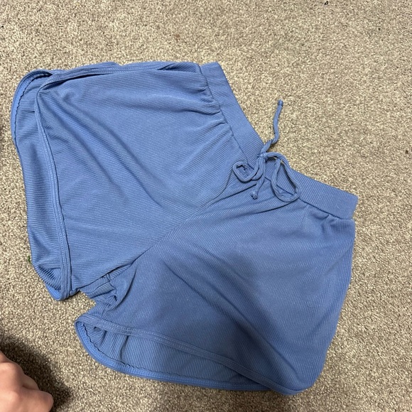 Comfortable blue ribbed knit shorts with a drawstring waist.