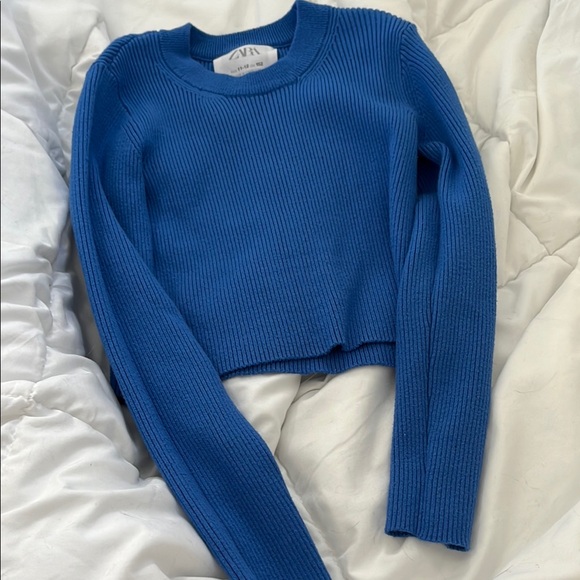 Stylish blue ribbed knit sweater. Perfect for casual wear.