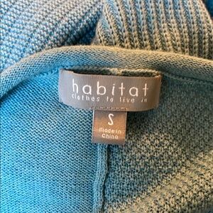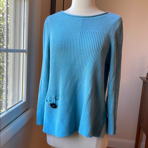 Stylish medium blue rolled collar knit sweater with varied contemporary pattern. Perfect for dress up white jeans. Front pocket with button detail. Gently preowned condition.
