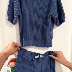Stylish blue ribbed knit top and bottom set. Perfect for a cozy day.