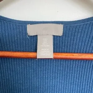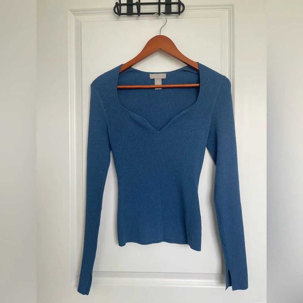 Chic blue ribbed blouse from H&M. Features a flattering neckline and long sleeves. Ideal for versatile styling.