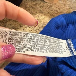 Blue ribbed long sleeve knit top with a cut-out tie back. The labels are missing, but the material feels like 73% polyester, 22% rayon, and 5% spandex. It measures to a size small and is in excellent condition with no issues.