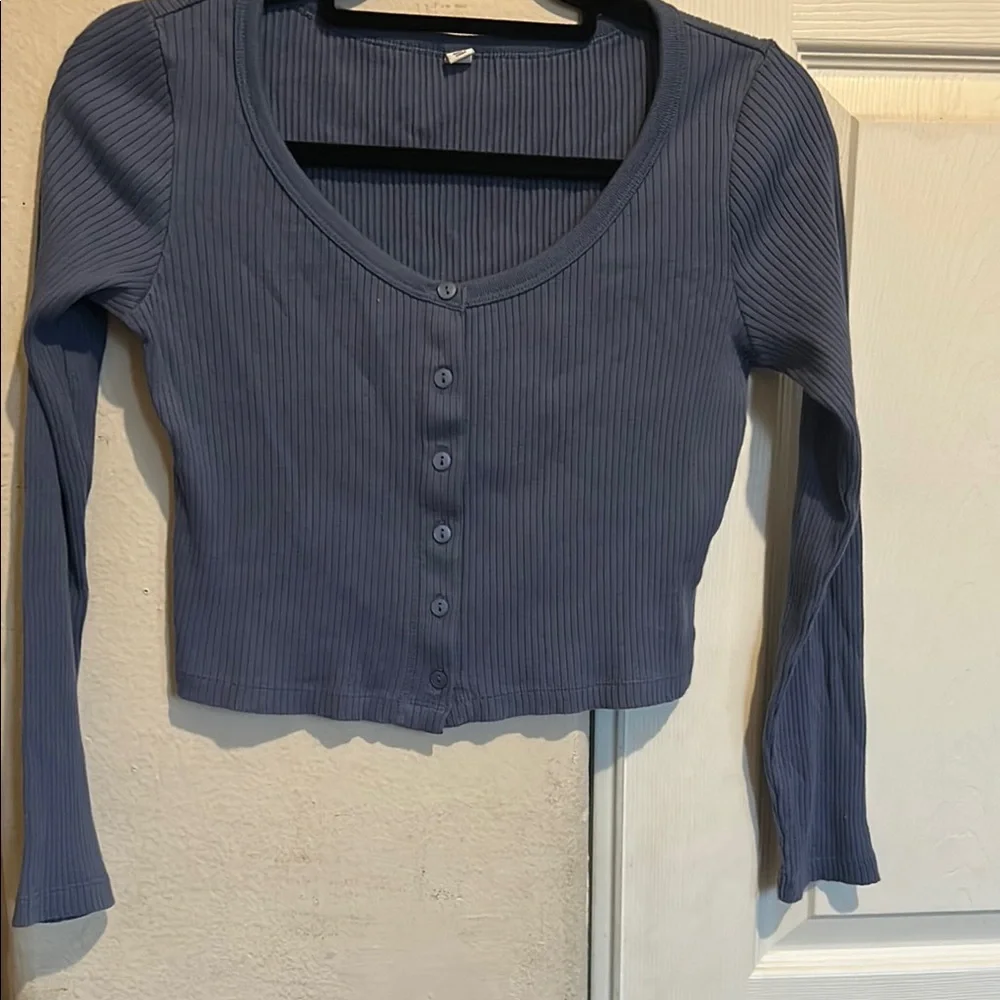 This stylish blue ribbed long sleeve top is perfect for any occasion. Its soft fabric and flattering fit make it a must-have in your wardrobe.