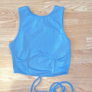 Never worn baby blue crop top and mini skirt matching set. Self ties so is very adjustable and can be styled uniquely. Size S- recommended sizes xs-medium it is very stretchy. Ribbed material. No flaws.