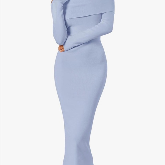 This stunning blue bodycon dress features a ribbed texture and an off-the-shoulder neckline, perfect for cocktail events. The long sleeves add a touch of elegance, while the form-fitting design highlights your silhouette.