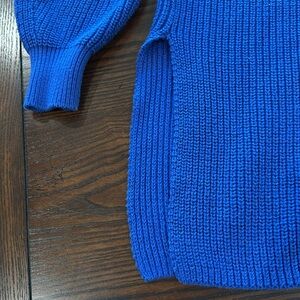 Cozy blue ribbed sweater. Perfect for cool weather. V in back, Side slits make it lose and comfortable. 28” long. 60% cotton, 40% acrylic
