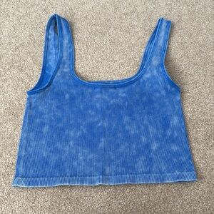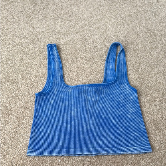 Stylish blue ribbed tank. Worn 1 time and is a stretch material. When I washed it the tag ripped off but it was a small.