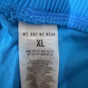 Soft ribbed two-piece bathing suite. Adjustable V-neck top with matching high-waist shorts. Stretchy, comfy knit. Bright blue color.