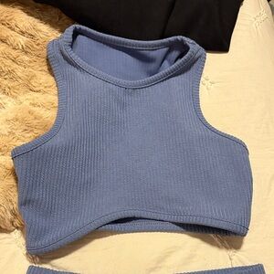 Stylish blue ribbed two-piece set. Includes a sleeveless crop top and matching skirt. worn once, in perfect condition