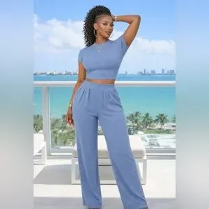 Elevate your style with this chic blue ribbed two-piece set. Perfect for any occasion, this outfit combines comfort and elegance.