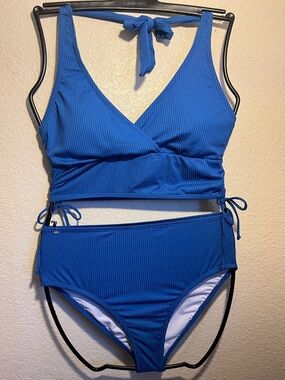 Two-piece ribbed swimsuit in vivid blue. V-neck wrap top with halter tie. High-waist bottoms with side tie accents. Stretchy, textured fabric for a flattering fit.