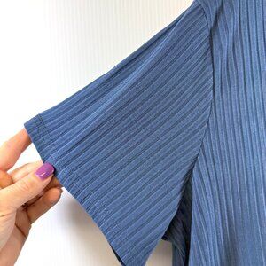 (blue ribbed top, V-neck ribbed shirt, short sleeve knit top, lightweight ribbed blouse, women’s casual top, stretchy rib knit shirt, blue V-neck blouse, minimalist top, soft ribbed tee, everyday basic top, flowy knit top, versatile blue shirt)