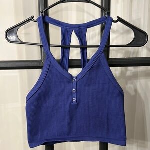 Stylish and comfortable blue ribbed crop top. Perfect for casual outings or workouts.