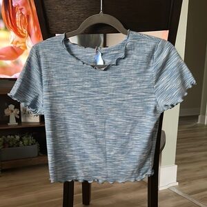 Stylish blue ribbed top with a unique scalloped edge. Perfect for casual outings.
