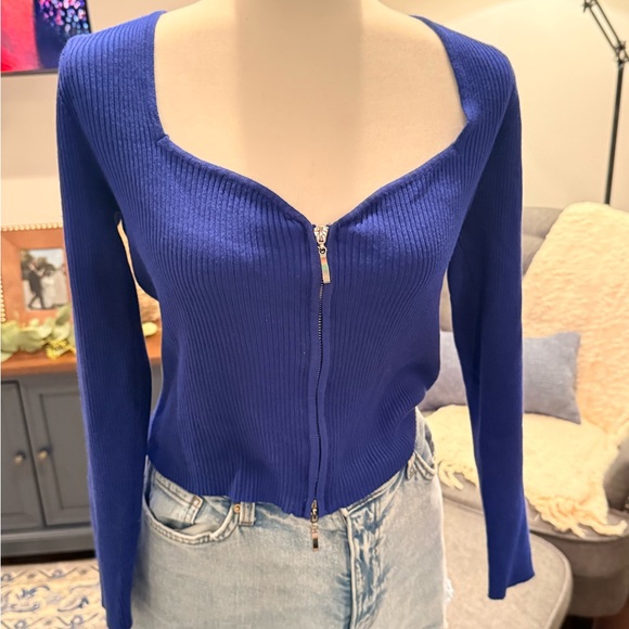 Stylish blue ribbed sweater with a front zipper. Perfect for casual wear.