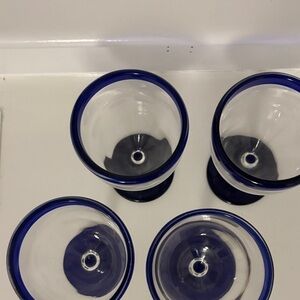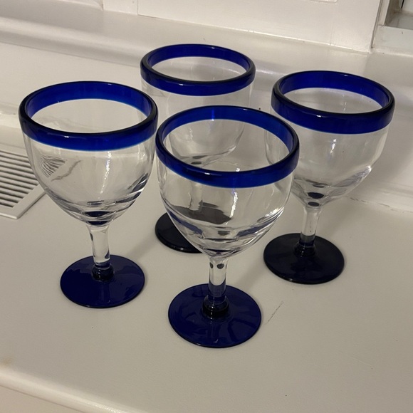 Set of 4 Elegant glass goblets with a striking blue rim, perfect for enhancing your dining experience. I have 3 sets of 4 available.