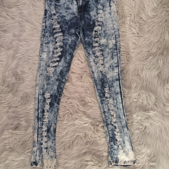 VIP Tie-Dye Blue Ripped High Rise/Waisted Jeans above navel button. Skinny Jean with Length 43 inches/Size fits 7/8.